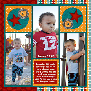 Inspiration is from Kerri today, this kit works perfectly for her playing in the park pictures. Love the big pics on both layouts! I hope you all are enjoying this wonderful weather and taking lots of pictures to scrap! Thanks for stopping by and Happy Scrappin'! :)